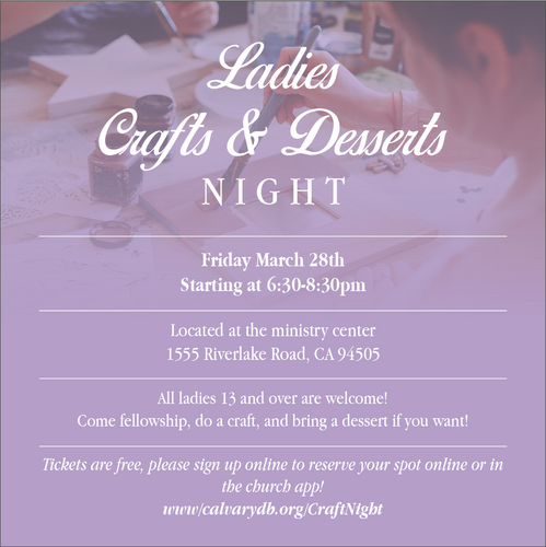 - All ladies 13 and over are welcome! Come fellowship, do a craft, and bring a dessert if you want!
